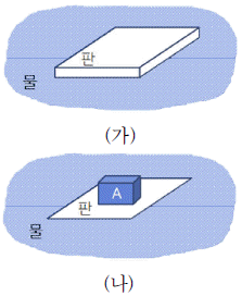 다음 그림 (가)와 같이 넓이 20m2, 두께 0.01m, 밀도 0.9g/cm3인 균일한 판이 물에 떠 있다. 그림 (나)와 같이 물체 A를 판 위에 올려놓아 판만 완전히 물에 잠겨 정지해 있는 상태라면, 물체 A의 질량(kg)은? (단, 물의 밀도는 1g/cm3이다.)