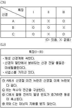 다음 표 (가)는 말초 신경계에 속하는 신경 A∼C에서 특징 I∼III의 유무를, (나)는 I∼III을 순서 없이 나타낸 것이다. A∼C는 운동 신경, 교감 신경, 부교감 신경을 순서 없이 나타낸 것이다. 이에 대한 설명으로 옳은 것만을 <보기>에서 모두 고른 것은?