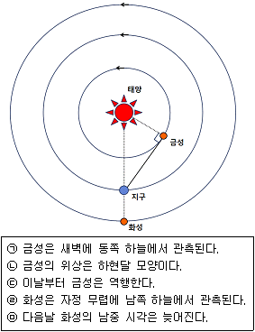 다음 그림은 어느 날 태양과 지구에 대한 금성과 화성의 상대적 위치를 나타낸 것이다. 이에 대한 설명으로 옳은 것만을 <보기>에서 모두 고른 것은?