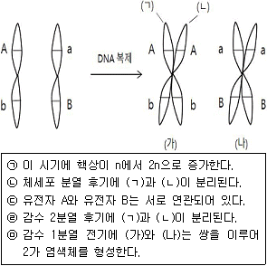 다음 그림은 상동 염색체 및 복제 과정을 나타낸 것이다. 이에 대한 설명으로 옳은 것만을 <보기>에서 모두 고른 것은? (단, (가)와 (나)는 상동 염색체이며, (ㄱ)과 (ㄴ)은 염색 분체이다)