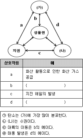 다음 그림은 지구계를 구성하는 환경 구성 요소 사이의 상호작용을, 표는 지구계에서 나타나는 다양한 상호작용의 예이다. 이에 대한 설명으로 옳은 것만을 <보기>에서 모두 고른 것은?