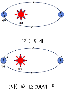 그림 (가)는 현재의 자전축 경사 방향을, 그림 (나)는 약 13,000년 후의 자전축 경사 방향을 모식적으로 나타낸 것이다. 이에 대한 설명으로 옳은 것은? (단, 지구 자전축 경사 방향 변화 이외의 요인은 변하지 않는다고 가정한다)