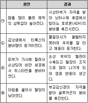 다음 표는 인체의 항상성 유지와 관련된 내용이다. 각각의 원인에 대한 결과로 옳은 것은?