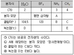 다음 표는 서로 다른 4가지 분자의 구조와 성질을 나타낸 것이다. 이에 대한 설명으로 옳은 것만을 보기에서 있는 대로 고른 것은? (단, 표의 공란은 무시한다.)