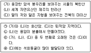 다음은 우리나라의 대표적인 지질 명소 세 지역을 나타낸 것이다. 이에 대한 설명으로 옳은 것만을 보기에서 있는 대로 고른 것은?