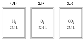 다음 그림은 0 ℃, 1 기압에서 3가지 기체가 밀폐된 용기에 각각 들어 있는 것을 나타낸 것이다. 이에 대한 설명으로 옳은 것은? (단, H, C, O의 원자량은 각각 1, 12, 16이다.)