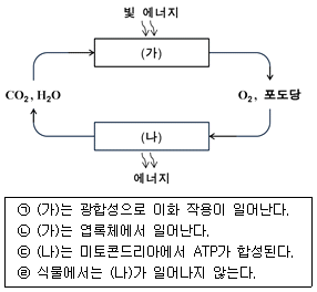 다음 그림은 광합성과 세포 호흡에서의 에너지와 물질의 이동을 나타낸 것이다. (가)와 (나)는 각각 광합성과 세포 호흡 중 하나이다. 이에 대한 설명으로 옳은 것을 보기에서 모두 고른 것은?