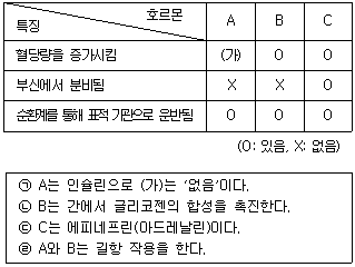 다음 표는 사람 몸에서 분비되는 호르몬 A∼C에 관한 특징의 유무를 나타낸 것이다. A∼C는 각각 글루카곤, 에피네프린(아드레날린), 인슐린 중 하나이다. 이에 대한 설명으로 옳은 것을 보기에서 모두 고른 것은?