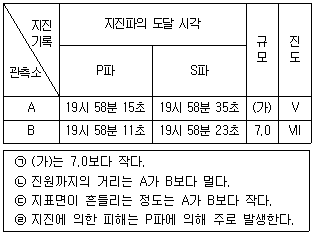 다음 표는 동일한 지진에 대한 관측소 A와 B의 지진 기록이다. 이에 대한 설명으로 옳은 것을 보기에서 모두 고른 것은?