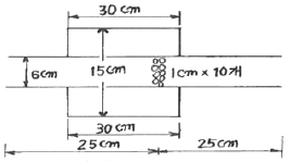 그림과 같이 내경 6cm, 두께 2mm인 관끝 무반사관 도중에 직경1cm의 작은 구멍이 10개 뚫린 관을 내경 15cm, 길이 30cm의 공동과 조합할 때의 공명주파수는? (단, 작은 구멍의 보정길이=내관두께+구멍반지름×1.6으로 하며, 음속은 344m/s로 한다.)