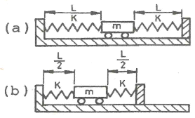 그림 (a)와 같은 진동계의 스프링을 압축하여 그림 (b)와 같이 만들었다. 압축된 후의 고유진동수는 처음에 비해 어떻게 변하는가? (단, 다른 조건은 변함없다고 가정한다.)