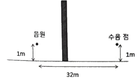 그림과 같은 방음벽에서 직접음의 회절감쇠기가 12dB(A), 반사음의 회절 감쇠치가 15dB(A), 투과 손실치가 16dB(A)이다. 이 방음벽의 삽입 손실치는 약 몇 dB(A)인가?