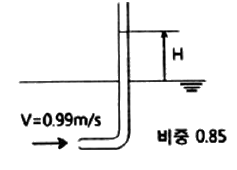 유속이 0.99m/s이고, 비중이 0.85인 기름이 흐르고 있는 곳에 피토관을 세웠을 때, 피토관에서 기름의 상승높이 (H)는 약 몇 mm인가?