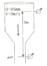 그림과 같이 수직관로를 통하여 물이 위에서 아래로 흐르고 있다. 손실을 무시할 때 상하에 설치된 압력계의 눈금이 동일하게 지시되도록 하려면 아래의 지름 d는 약 몇 mm로 하여야 하는가? (단, 위의 압력계가 있는 곳에서 유속은 3 m/s, 안지름은 65mm 이고, 압력계의 설치 높이 차이는 5m 이다.)