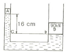 그림에서 피스톤 A와 피스톤 B의 단면적이 각각 6cm2, 600cm2 이고, 피스톤 B의 무게가 90 kN이며, 내부에는 비중이 0.75 인 기름으로 채워져 있다. 그림과 같은 상태를 유지하기 위한 피스톤 A의 무게는 약 몇 N인가? (단, C와 D는 수평선상에 있다.)