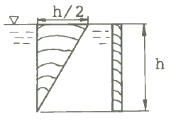 그림과 같이 높이가 h이고 윗변의 길이가 h/2 인 직각 삼각형으로 된 평판이 자유표면에 윗변을 두고 물속에 수직으로 놓여 있다. 물의 비중량을 γ라고 하면, 이 평판에 작용하는 힘은?