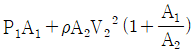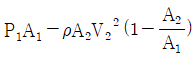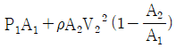 수평 노즐 입구에서의 계기압력아 P1Pa, 면적이 A1m2이고, 출구에서의 면적은 A2m2이다. 물이 노즐을 통해 V2m/s의 속도로 대기 중으로 방출될 때 노즐을 고정 시키는데 필요한 힘(N)은 얼마인가? (단, 물의 밀도는 ρ㎏/m3이다.)