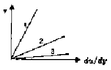 그림은 원유, 물, 공기에 대하여 전단응력과 속도기울기의 관계를 나타낼 것이다. 물에 해당하는 선은?