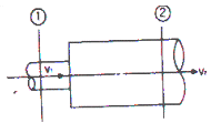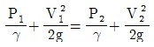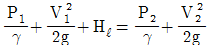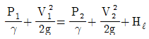 그림과 같은 수평 관로에서 유체가 ①에서 ②로 흐르고 있다. ①, ②에서의 압력과 속도를각각 P1, V1 및 P2, V2라 하고 손실수두를 Hℓ이라 할 때 에너지 방정식은?