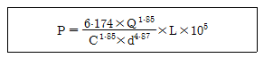 하젠-윌리엄스(Hagen-Williams)공식에서 P는 무엇을 나타내는가? (단, Q = 유량[L/min], C = 조도계수, d= 관의 내경[mm], L = 관의길이[m])