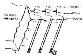 다음과 같이 비전기식뇌관을 이용한 노천발파를 설계하였다. 이 때 가운데 열의 공저뇌관은 475ms 지연시차를 가진 뇌관을 사용하였으며, 바깥쪽 열은 500ms 지연시차를 가진 뇌관을 사용하였다. 지표면의 연결뇌관은 최초 기폭시작점에서는 0ms, 이후 연결부에서는 42ms 지연시차를 사용하였다면, ㉮위치 뇌관의 기폭시차는 얼마인가?