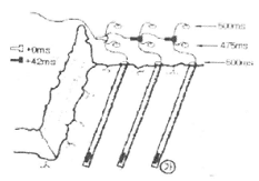 다음과 같이 비전기식 뇌관을 이용한 노천발파를 설계하였다. 이때 가운데 열의 공저뇌관은 475ms 지연시차를 가진 뇌관을 사용하였으며, 바깥쪽 열은 500ms 지연시차를 가진 뇌관을 사용하였다. 지표면의 연결뇌관은 최초 기폭 시작점에서는 1ms, 이후 연결부에서는 42ms 지연시차를 사용하였다면, ㉮위치 뇌관의 기폭시차는 얼마인가?