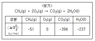 각 성분의 생성 Gibbs에너지( )가 <보기>와 같다면 298K에서 메탄가스(CH4)의 연소반응에 대한 반응 Gibbs에너지(reaction Gibbs energy, 및 이 반응의 자발성에 대한 설명으로 가장 옳은 것은?