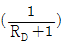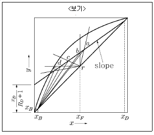 McCabe-Thiele 법으로 증류탑을 설계할 때, 이 탑의 어떤 단(n)에서 조작선의 식을 작도하였더니 <보기>와 같이 y 절편이 이었다. 이 조작선의 기울기(slope)는? (단, RD는 환류비이다.)