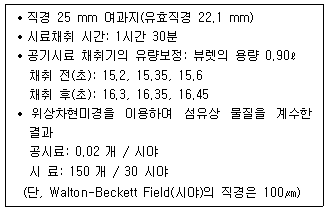 다음 조건을 고려하여 공기 중 섬유상물질의 농도(개/cm3)를 구하면 약 얼마인가?
