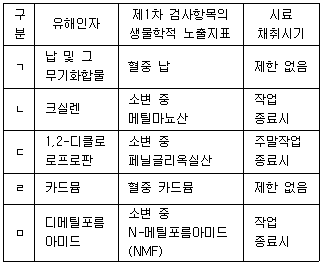 산업안전보건법 시행규칙상 유해인자별 제1차 검사항목의 생물학적 노출지표 및 시료 채취시기가 옳지 않은 것은?