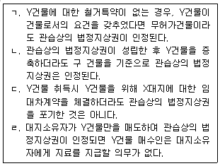 X대지에 Y건물이 있고, X대지와 Y건물은 동일인의 소유이다. 개업공인중개사가 Y건물에 대해서만 매매를 중개하면서 중개의뢰인에게 설명한 내용으로 옳은 것을 모두 고른 것은? (다툼이 있으면 판례에 따름)