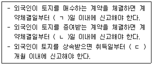 부동산 거래신고 등에 관한 법령상 국내 토지를 외국인이 취득하는 것에 관한 설명이다. ( )에 들어갈 숫자로 옳은 것은? (단, 상호주의에 따른 제한은 고려하지 않음)