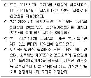 다음 자료를 기초로 할 때 소득세법령상 국내 토지A에 대한 양도소득세에 관한 설명으로 옳은 것은? (단, 甲, 乙, 丙은 모두 거주자임)