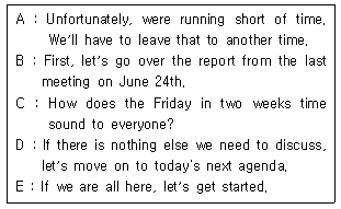 다음은 비즈니스 회의의 대화 내용을 일부 발췌한 것이다. 일어날 수 있는 순서대로 나열한 것은?
