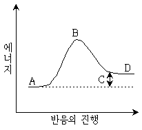 다음 에너지 도표에 해당하는 반응에 촉매를 가하여 반응 속도가 빨라졌을 때, A~D 중에서 가장 큰 영향을 받는 부분은?