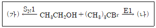 다음 반응이 SN1 반응 또는 E1 반응으로 진행될 때, (가)와 (나)의 주생성물은? (순서대로 (가), (나))