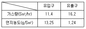 아래 표는 전기로에 부설된 bag filter의 유입구 및 유출구의 가스량과 먼지농도를 측정한 것이다. 먼지통과율을 구하면?