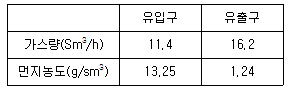아래 표는 전기로에 부설된 Bag filter의 유입구 및 유출구의 가스량과 먼지농도를 측정한 것이다. 먼지 통과율(%)로 옳은 것은?