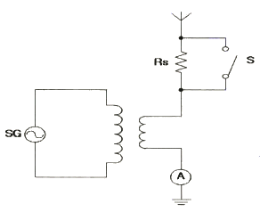 다음 그림과 같이 결선하여 안테나의 실효저항을 측정하고자 한다. 회로에서 신호발생기(SG)의 주파수를 안테나에 공진시키고 스위치 S를 닫았을 때 A의 지시가 6[A], 스위치 S를 열었을 때 4[A]이면 안테나의 실효저항(Re)은 얼마인가? (단, Rs는 10[Ω] 이며, A의 내부저항은 무시한다.)