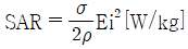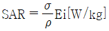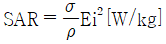 전자파흡수율(SAR : Specific Absorption Rate)은 전자파가 인체에 얼마나 흡수되었는지를 나타내는 수치이다. 다음 중 전자파흡수율을 나타내는 식은 무엇인가? (단, σ : 조직 도전율[S/m], ρ : 조직의 밀도[kg/m3], Ei : 내부 전자기장의 첨두치)