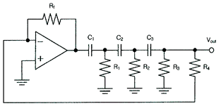 다음 회로에서 정현파를 발생시키는 발진기로 동작하기 위한 저항 Rf의 값은? (단, C1=C2=C3=0.001[μF]이고 R1=R2=R3=10[KΩ], R4=5[KΩ])
