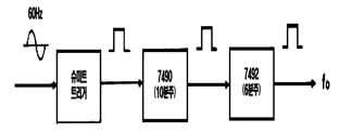 다음의 회로에서 가정용 전원의 주파수 60[Hz]인 정현파를 적용했을 때 최종 구형파의 출력 주파수(fo)는?