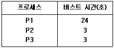다음은 CPU에 서비스를 받으려고 도착한 순서대로 프로세스와 그 서비스 시간을 나타낸다. FCFS(first Come Served) CPU Scheduling에 의해서 프로세스를 처리한다고 했을 경우 프로세스의 평균 대기시간은 얼마인가?
