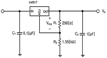 다음 3단자 전압 레귤레이터 IC 회로에서 직류 출력전압을 조절할 수 있는 파라미터가 아닌 것은? (단, Vreg=1.25[V], IR1=5[mA], IADJ=100[μA] 이다.)