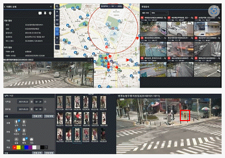 다음 그림과 같이 절도 사건으로 의심되는 용의자의 인상착의 ‘검은색 바지와 빨간색 상의’ 정보를 이용하여 해당 지역의 카메라가 키워드로 입력된 정보를 바탕으로 동시에 팝업되어 키워드와 관련된 이벤트 지점의 주변까지 모니터링하는 관제기법은?
