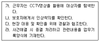 통합관제센터에서 근무 중 CCTV 스마트 폴에 설치된 비상벨로 동행자가 실종되었다는 신고가 접수되었다. 다음 중 가장 적합한 처리 순서는?