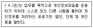 1 영상정보처리기기를 관리하는 관제센터에 대한 설명으로 옳지 않은 것은? 2 지방자치단체의 영상정보 관제센터 운영 목적에 대한 설명으로 옳지 않은 것은? 3 통합관제센터 관제요원(영상정보관리사)의 주요 역할로 옳지 않은 것은? 4 「개인정보 보호법」제16조에 따른 ‘개인정보의 수집 제한' 에 관한 설명으로 옳지 않은 것은? 5 다음 설명에 해당하는 용어( A )는? 6 「개인정보 보호법」 제25조에 따라 공개된 장소에서 고정형 영상정보처리기기를 설치·운영할 수 있는 경우에 해당하는 것은? 7 「개인정보 보호법」 및 동법 시행령에 따른 영상정보처리 기기의 설치·운영 기준에 대한 설명으로 옳지 않은 것은? 8 「개인정보 보호법 시행령」 제3조에 따른 ‘고정형 영상정보처리기기’의 설명으로 옳은 것은? 9 「개인정보 보호법」제29조 및 동법 시행령 제30조는 개인정보처리자가 안전성 확보를 위해 관리적·물리적·기술적 조치를 취하도록 규정하고 있다. 다음 중 기술적 보안 영역에 해당하는 것은? 10 「학교폭력예방 및 대책에 관한 법률」 제20조의7에 따라 영상정보처리기기의 통합 관제에 관하여 동 법에서 규정한 것을 제외하고는 「개인정보 보호법」을 적용하도록 하고 있다. 학교 내외에 설치된 영상정보처리기기가 통합 관제되는 경우 해당 학교의 영상정보처리기기운영자가「개인정보 보호법」및 동법 시행령에 따라 반드시 마련해야 하는 것은? 11 「의료법」제38조의2 제2항에 따른 ‘수술실 내 CCTV 촬영 거부 사유’에 대한 설명으로 옳지 않은 것은? 12 전자 출입통제 인증 시스템이란 출입 제한구역에 대하여 허가된 사람에 한해 신원이 확인된 경우에 출입이 가능하도록 인증 수단을 구축한 시스템을 말한다. 다음 중 지식 기반 인증에 해당하는 것은?
