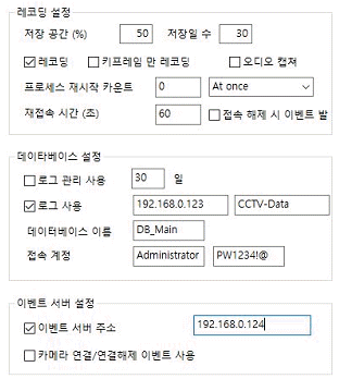 다음은 영상정보관리 서버 설정 화면 중 일부의 예이다. 다음과 같이 설정하였을 경우 기능과 내용이 올바르게 연결되어 있지 않은 것은?