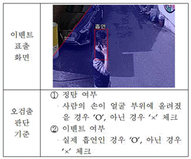 지능형영상정보솔루션 이벤트 표출 화면의 한 예이다. 아래 제시된 화면과 오검출 판단 기준을 바탕으로 영상정보관리운영자가 CCTV 영상 알람 정보 기록을 올바르게 작성한 것은?