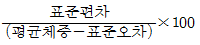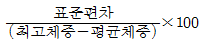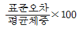 브로일러 종계의 체중조절을 위해서는 계군 평균체중 조사를 2주령부터 초산 시까지 매주 실시해야 하는데, 계군의 평균체중의 균일성을 알기 위해 사용하는 방법 중 변이계수를 구하는 식은?